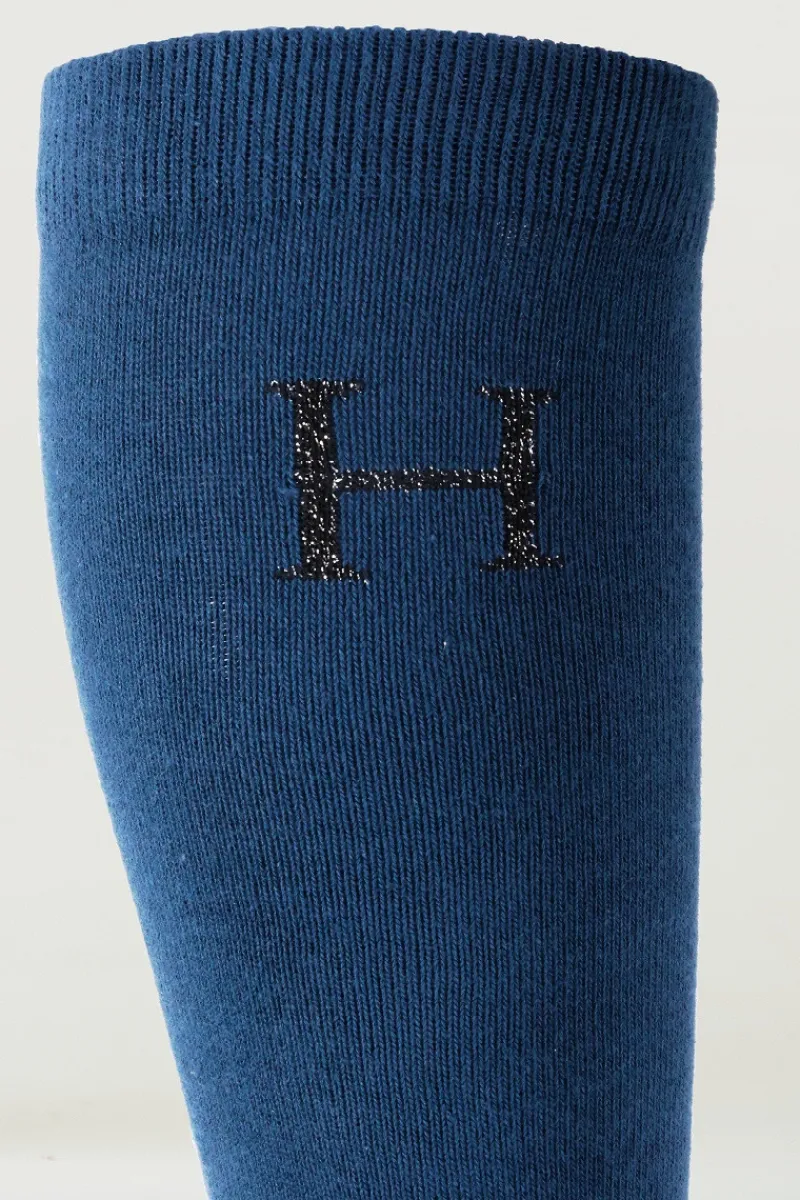 Détail du H en fils pailletés sur le côté extérieur de la chaussette